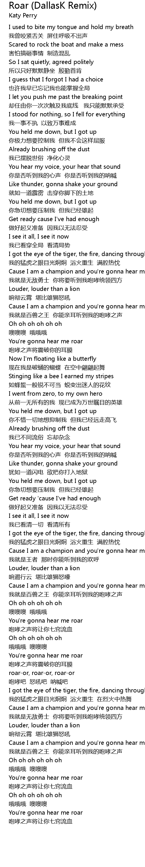 | Cause I am a champion and you' re gonna hear me roar | |