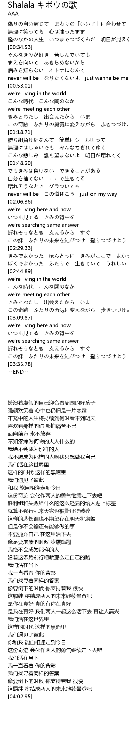 | [00:20.10] | 偽りの自分演じて まわりの「いい子」に合わせて |
