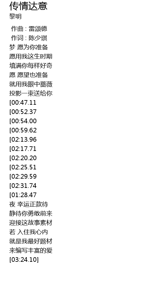 | [03:00.14][02:13.96][01:04.53] | 我脉膊在传情达意 |