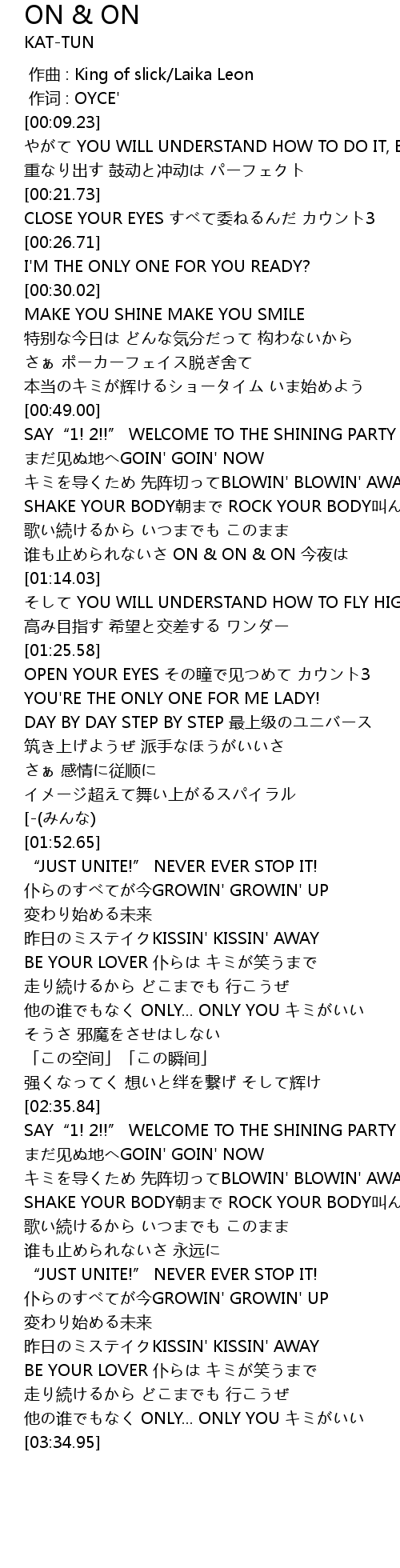 | [01:09.50] | 谁も止められないさ ON & ON & ON 今夜は |