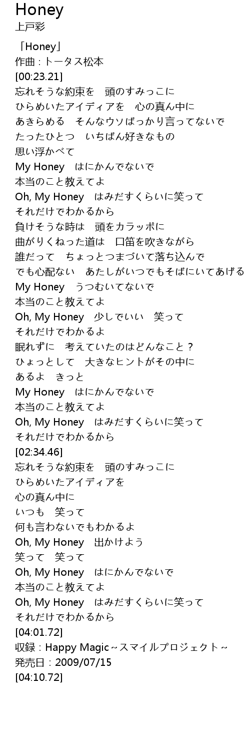 | [03:50.35] | Oh, My Honey はみだすくらいに笑って |