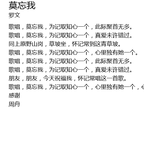 | 歌唱,莫忘我,为记取知心一个,心里独有她一个。 | |