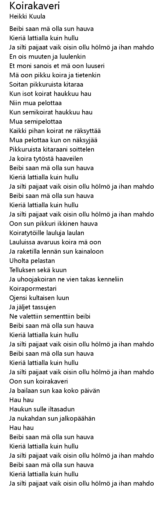| [00:33.77] | Mä oon pikku koira ja tietenkin |