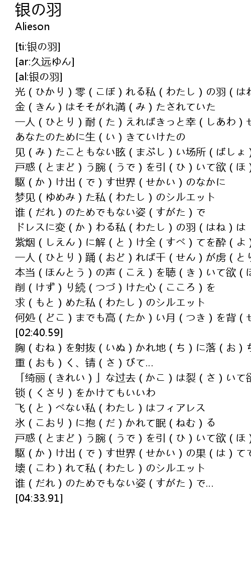 | [00:23.92] | 光(ひかり)零(こぼ)れる私(わたし)の羽(はね)に |