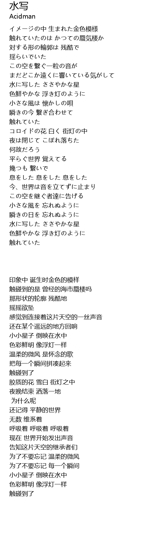 | [02:42.35] | コロイドの花 白く 街灯の中 |