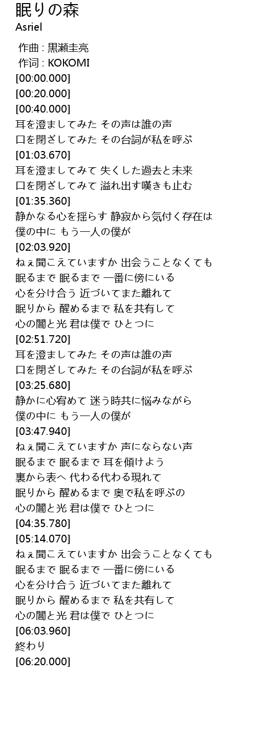 | [04:12.410] | 眠りから 醒めるまで 奥で私を呼ぶの |