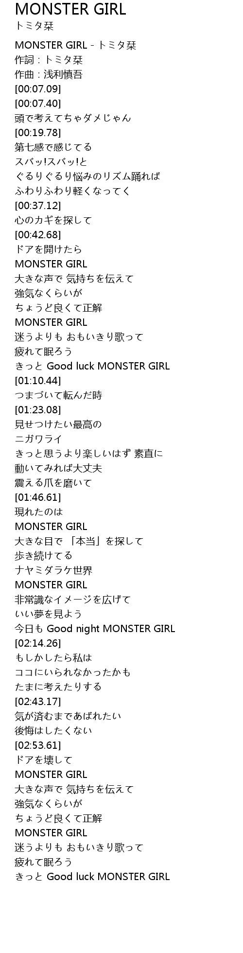 | [01:06.70] | きっと Good luck MONSTER GIRL |