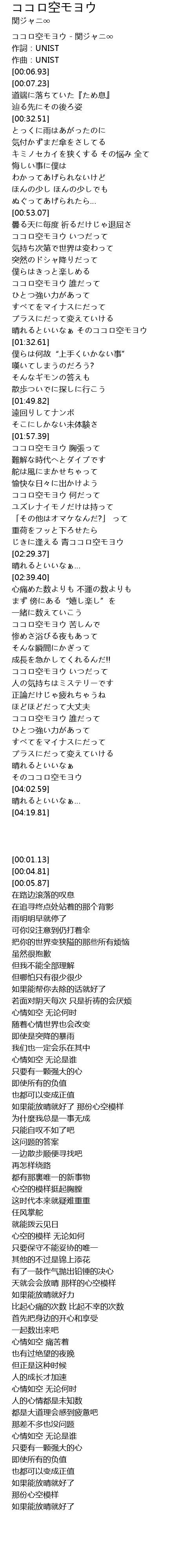 | [00:01.13] | ココロ空モヨウ - 関ジャニ∞ |