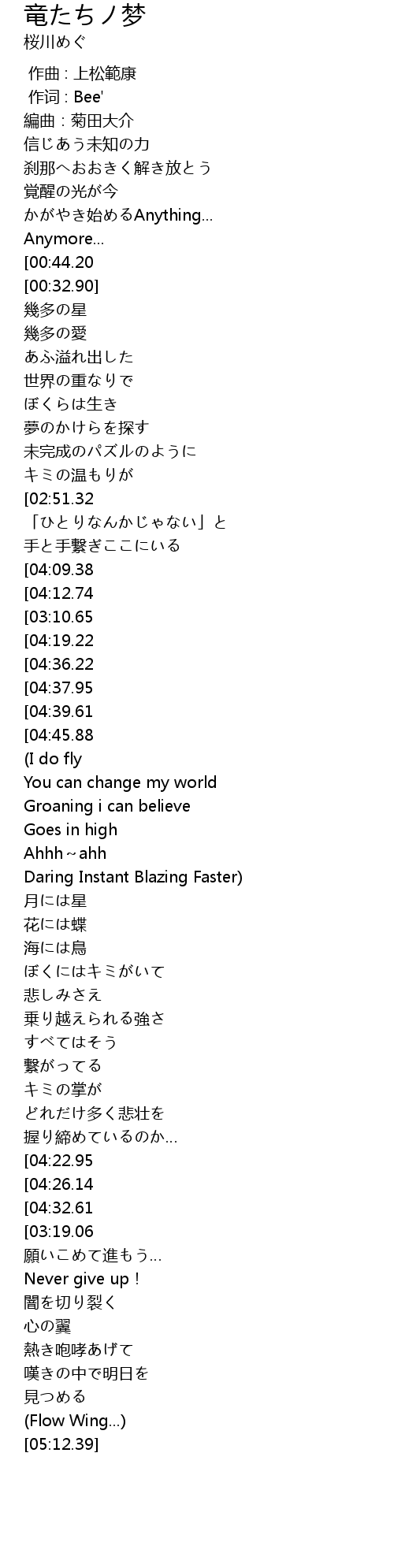 | [01:34.94][03:10.65][04:16.14][04:29.51] | 猛し竜がぼくらの |