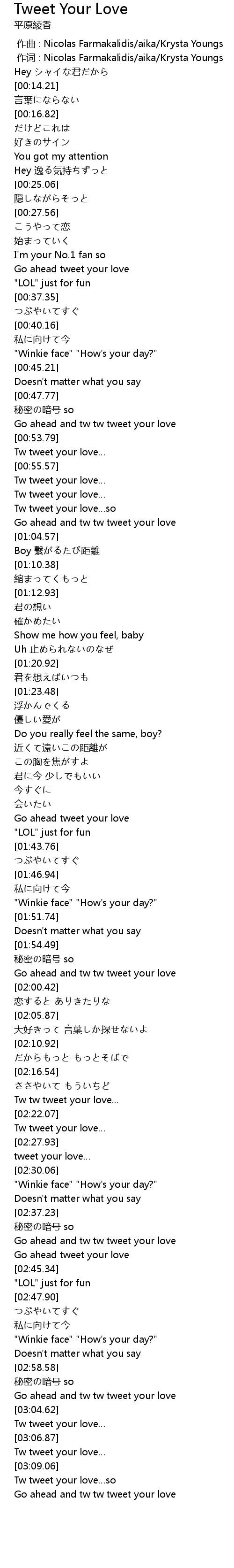 | [01:02.51] | Go ahead and tw tw tweet your love |