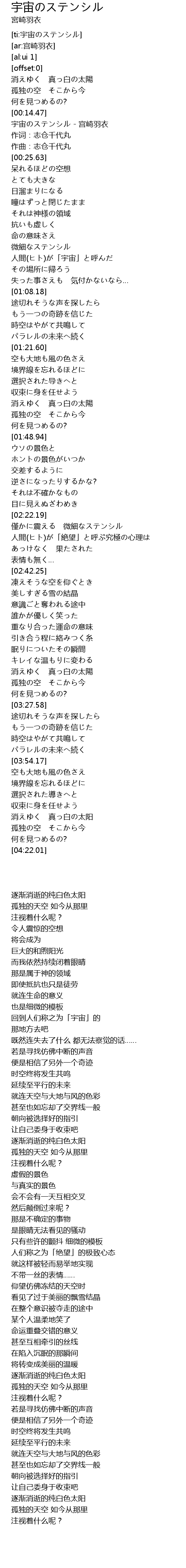| [00:14.99] | 宇宙のステンシル - 宫崎羽衣 |