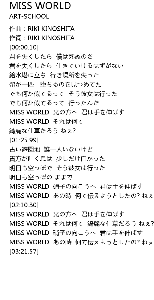 | [02:00.66] | MISS WORLD あの時 何て伝えようとしたの? ねぇ? |