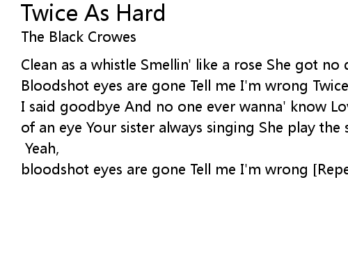 | Clean as a whistle Smellin' like a rose She got no dirty little fingers Bloodshot eyes are gone Tell me I'm wrong Twice as Hard As it was the first time I said goodbye And no one ever wanna' know Love ain't funny A crime in the wink of an eye Your sister always singing She play the step child A broken little memory Her heart was never kind Tell me I'm blind [Repeat Chorus] Yeah, bloodshot eyes are gone Tell me I'm wrong [Repeat Chorus 5 times] |