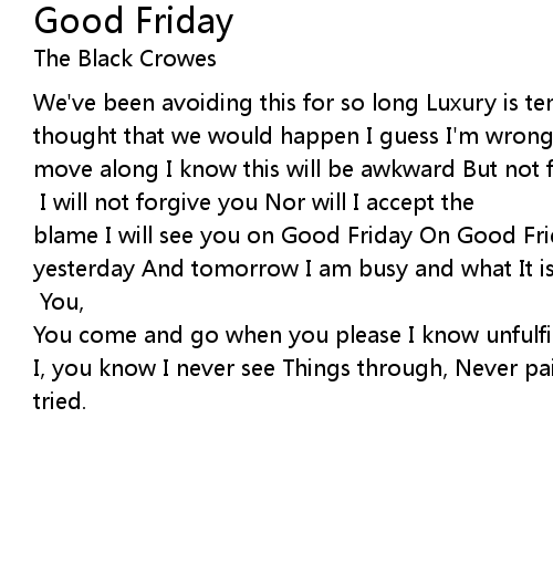 We've been avoiding this for so long Luxury is temporary then it's gone I thought that we would happen I guess I'm wrong wel say hi on the street then move along I know this will be awkward But not for long Cause soon you'll have a new boy To sing you songs [Chorus] I will not forgive you Nor will I accept the blame I will see you on Good Friday On Good Friday I'm sorry I couldn't do this yesterday And tomorrow I am busy and what It is I can't say And Saturday's no good I got a show So it's got to be Good Friday Then it's so long [Bridge] You, You come and go when you please I know unfulfilled heads I know you do too But I, you know I never see Things through, Never paid attention to you But honey I tried. |