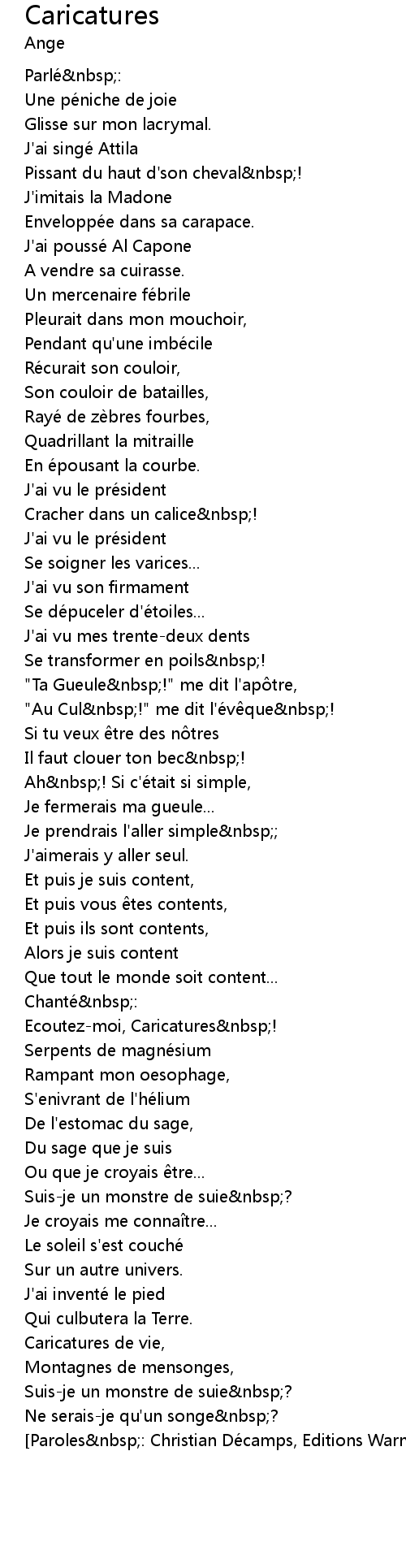 | Paroles nbsp: Christian Dé camps, Editions WarnerChappell 1972 |