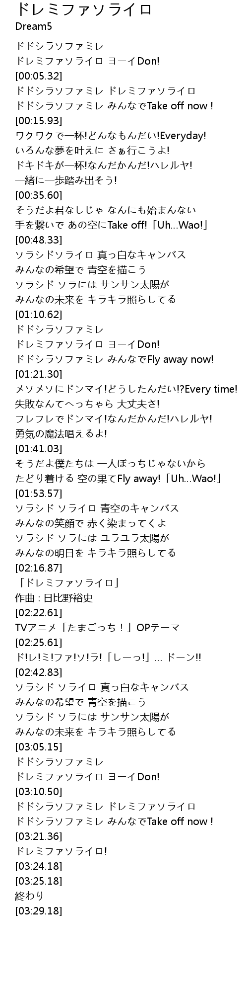 | [03:16.75] | ドドシラソファミレ みんなでTake off now ! |