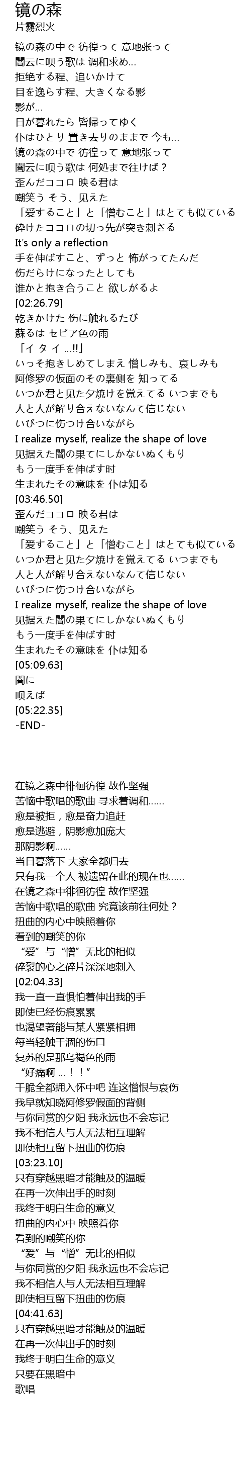 | [00:33.69] | 镜の森の中で 彷徨って 意地张って |