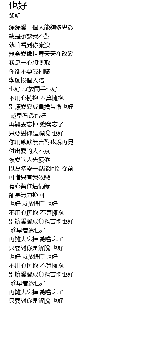 | [01:05.410] | 也好 就放開手也好 |