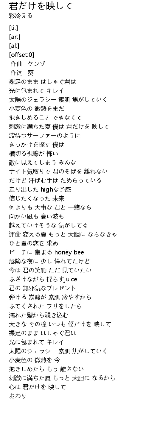 | [00:34.15] | 刺激に満ちた夏 僕は 君だけを 映して |