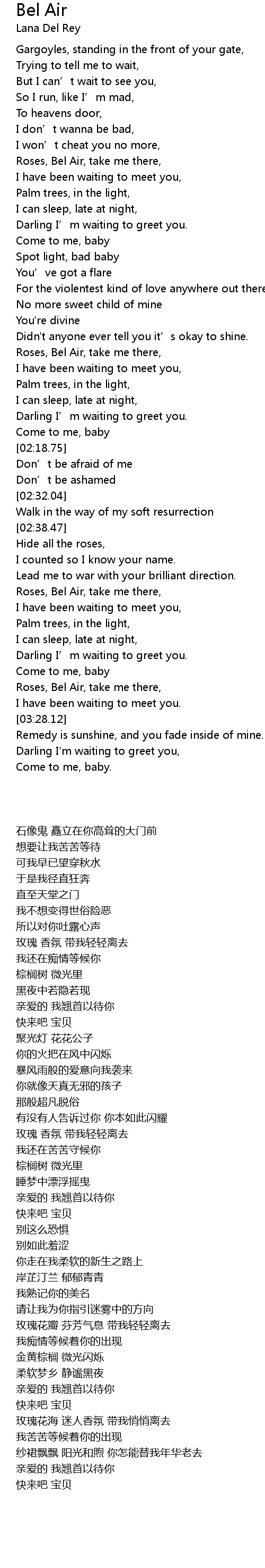 | [00:54.82] | Roses, Bel Air, take me there, |
