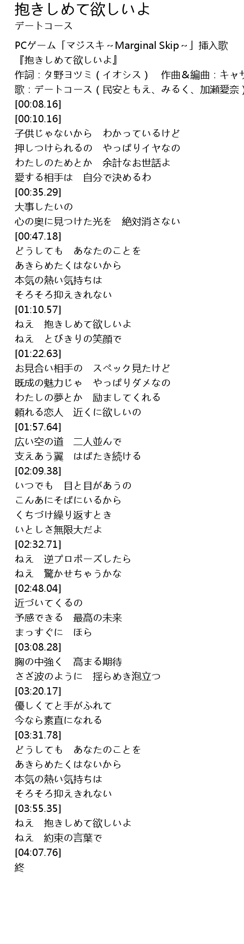 | [03:55.60] | ねえ 抱きしめて欲しいよ |