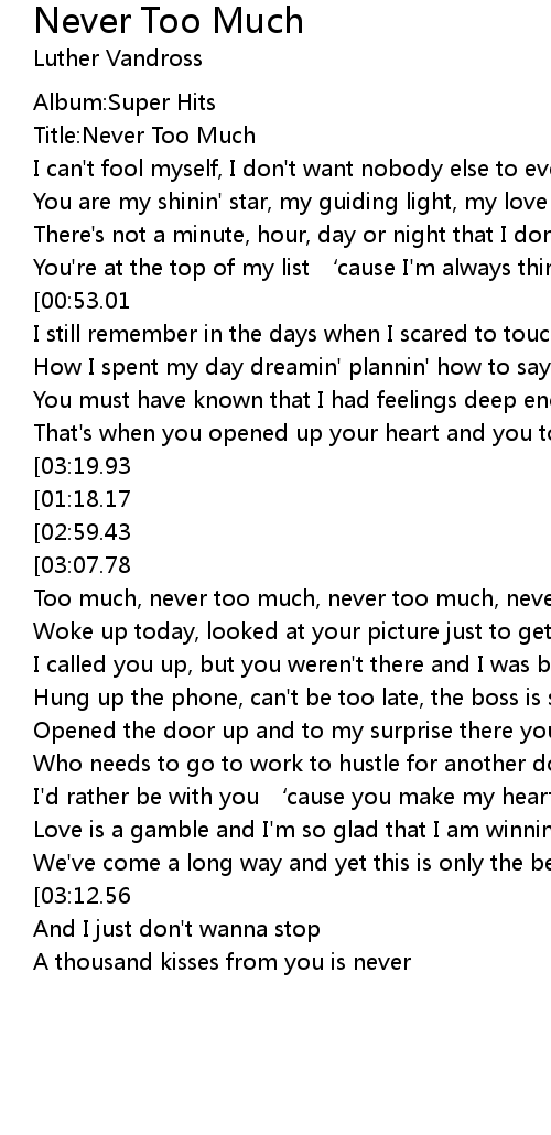 | [00:12.18] | Title: Never Too Much |