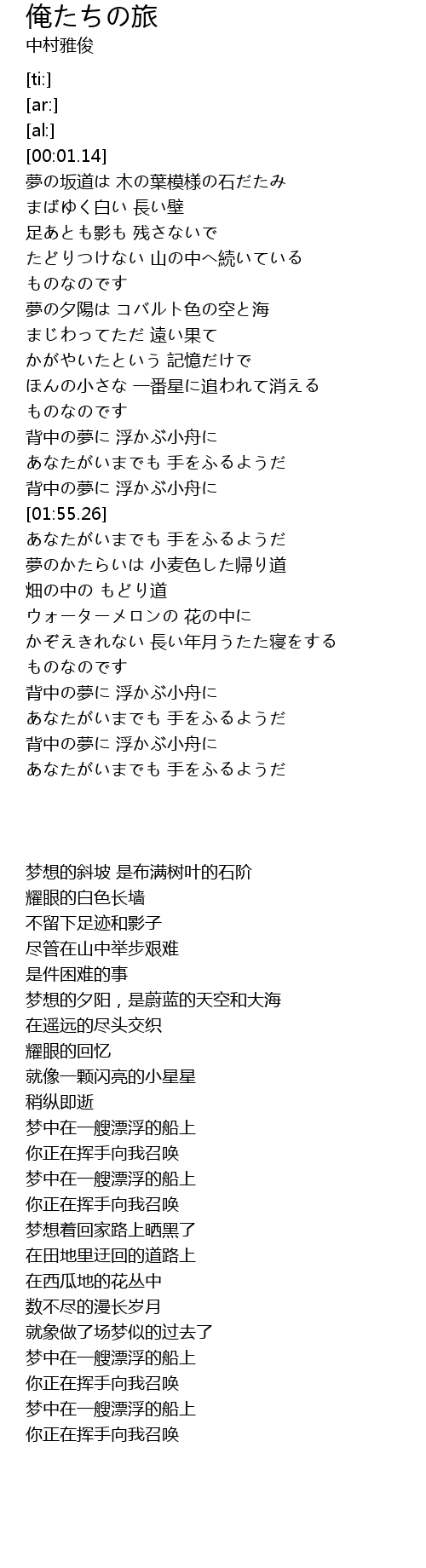 | [01:35.19] | 背中の夢に 浮かぶ小舟に |