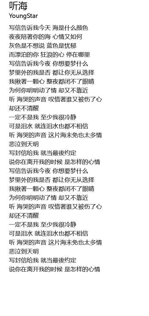 | [03:14.84] | 听 海哭的声音 叹惜著谁又被伤了心 |