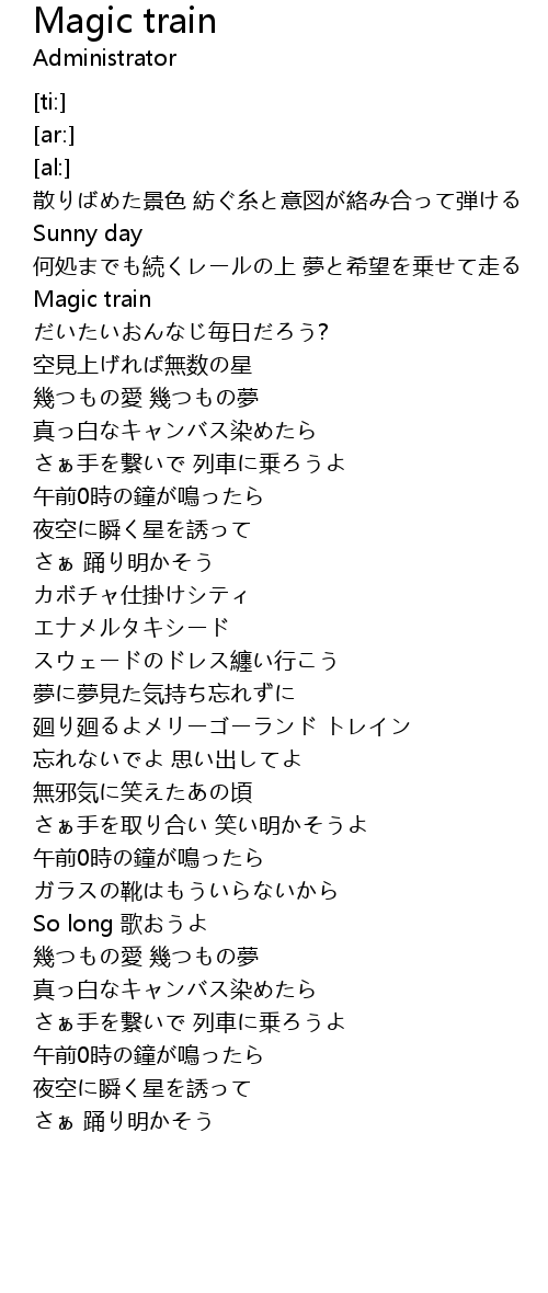 | [00:35.17] | 何処までも続くレールの上 夢と希望を乗せて走る Magic train |