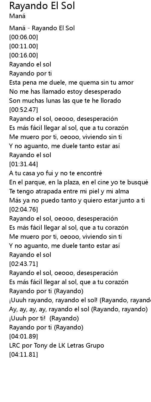 | [00:01.00] | Mana Rayando El Sol |
