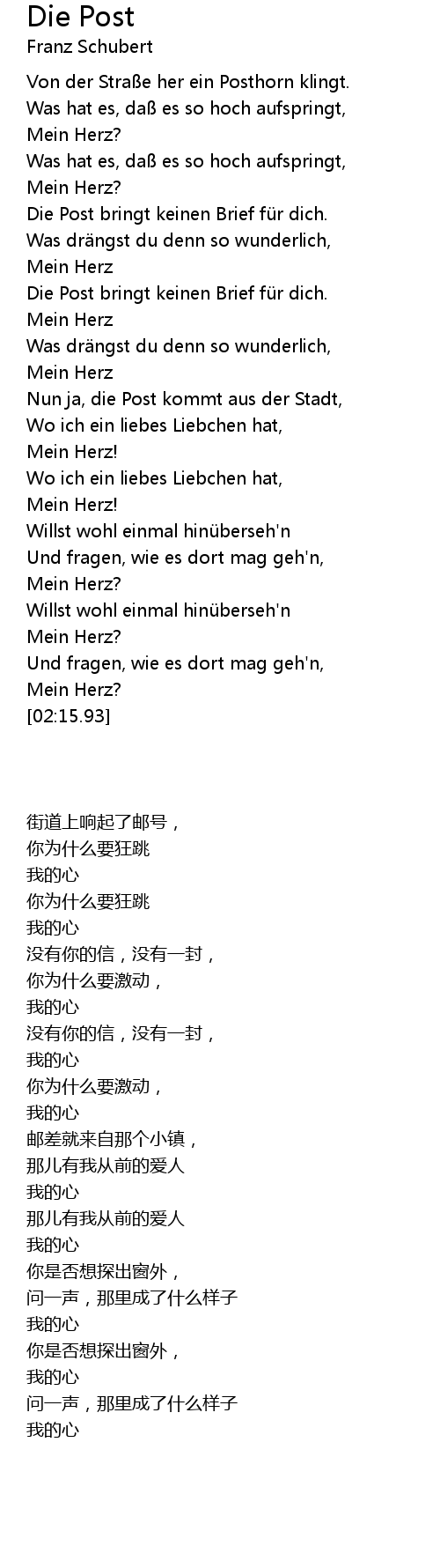 | [00:10.88] | Von der Stra e her ein Posthorn klingt. |