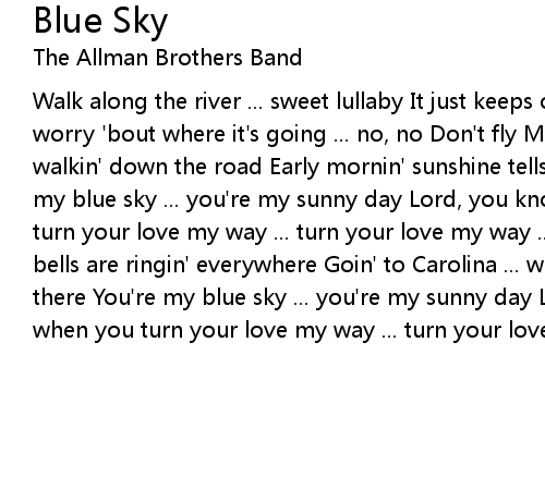 Walk along the river ... sweet lullaby It just keeps on flowin' ... it don't worry 'bout where it's going ... no, no Don't fly Mister blue bird I'm just walkin' down the road Early mornin' sunshine tells me all I need to know You're my blue sky ... you're my sunny day Lord, you know it makes me high when you turn your love my way ... turn your love my way ... yeah Good ol' Sunday mornin' bells are ringin' everywhere Goin' to Carolina ... won't be long til I'll be there You're my blue sky ... you're my sunny day Lord, you know it makes me high when you turn your love my way ... turn your love my way ... yeah, yeah |