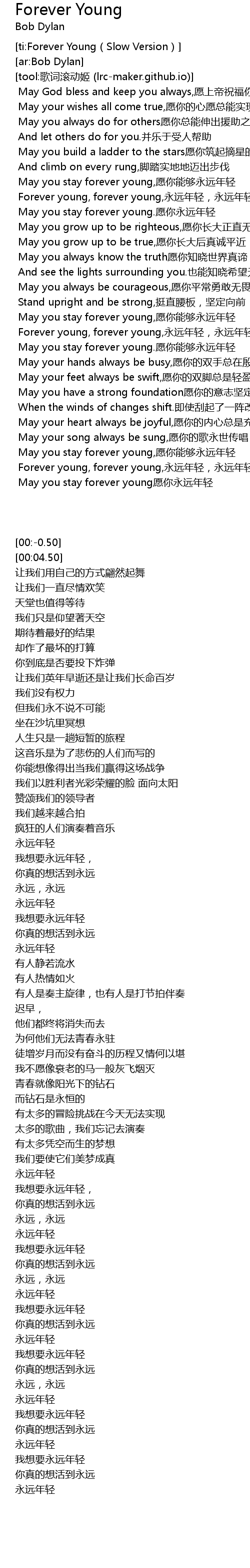 | [00:55.792] | Forever young, forever young, yǒng yuǎn nián qīng, yǒng yuǎn nián qīng |
