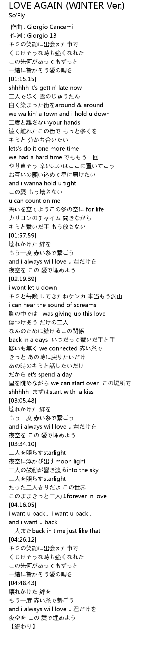 | [02:58.07] | 星を眺めながら we can start over この場所で |