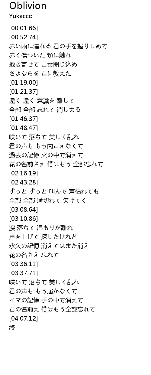 | [03:59.23] | 君の名前え 僕はもう全部忘れて |