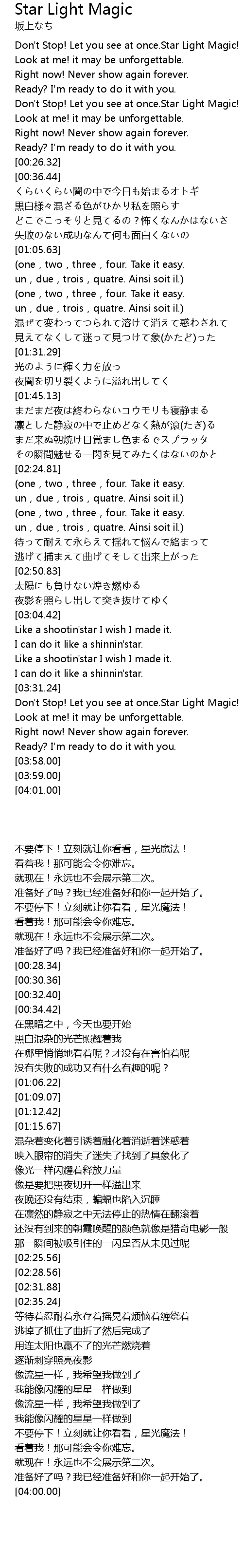| [00:13.04] | Don' t Stop! Let you see at once. Star Light Magic! |