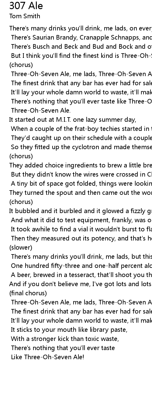 Three-Oh-Seven Ale, me lads, Three-Oh-Seven Ale, |