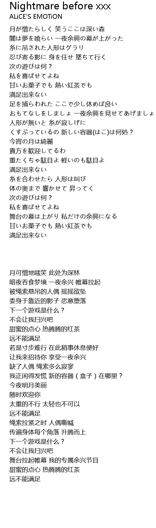 | [00:31.65] | 闇は夢を喰らい 一夜余興の幕が上がった |