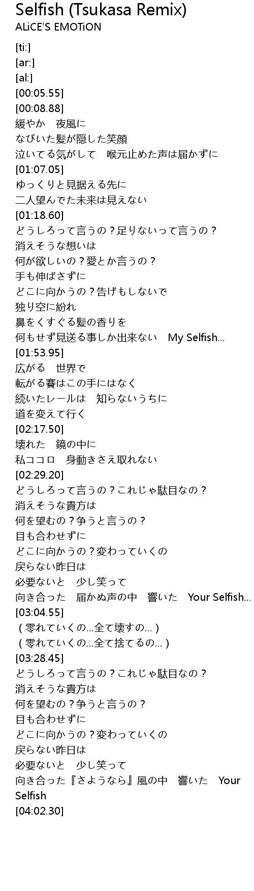 | [03:49.40] | 向き合った『さようなら』風の中 響いた Your Selfish |