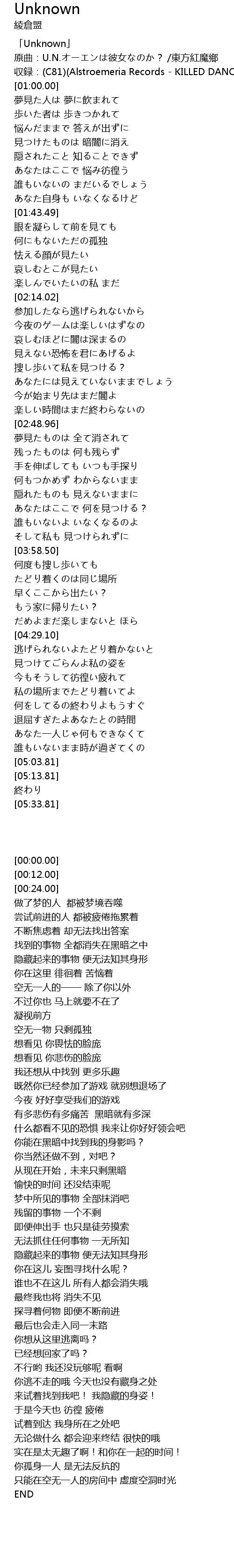 | [00:12.00] | 原曲:U.N.オーエンは彼女なのか? /東方紅魔鄉 |