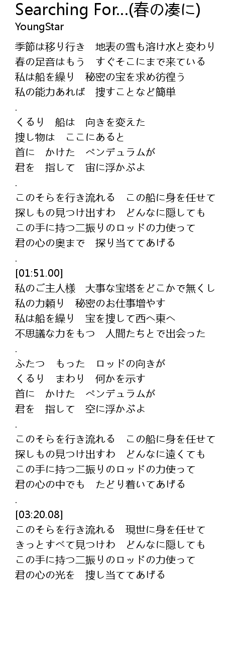 | [00:42.81] | 私は船を繰り 秘密の宝を求め彷徨う |