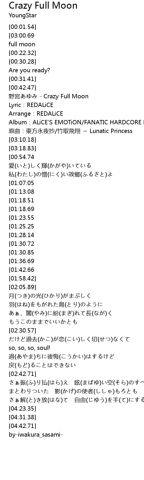 | [04:12.69][03:00.69][01:48.64][00:12.67] | 禁忌(きんき)を犯(おか)す 蓬莱(ほうらい)の性(さが) crazy full moon |