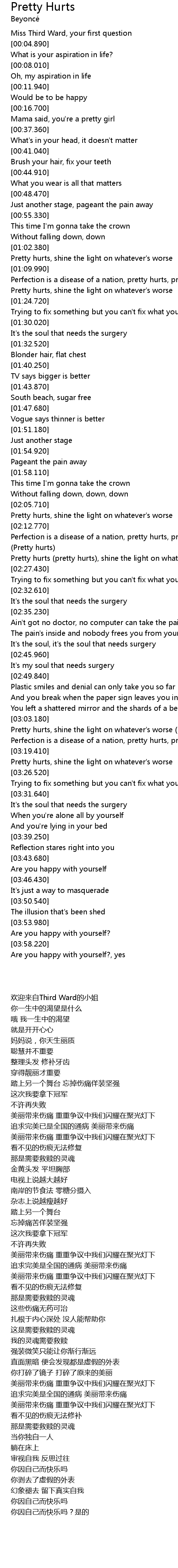 | [03:05.430] | Pretty hurts, shine the light on whatever's worse (pretty hurts) |