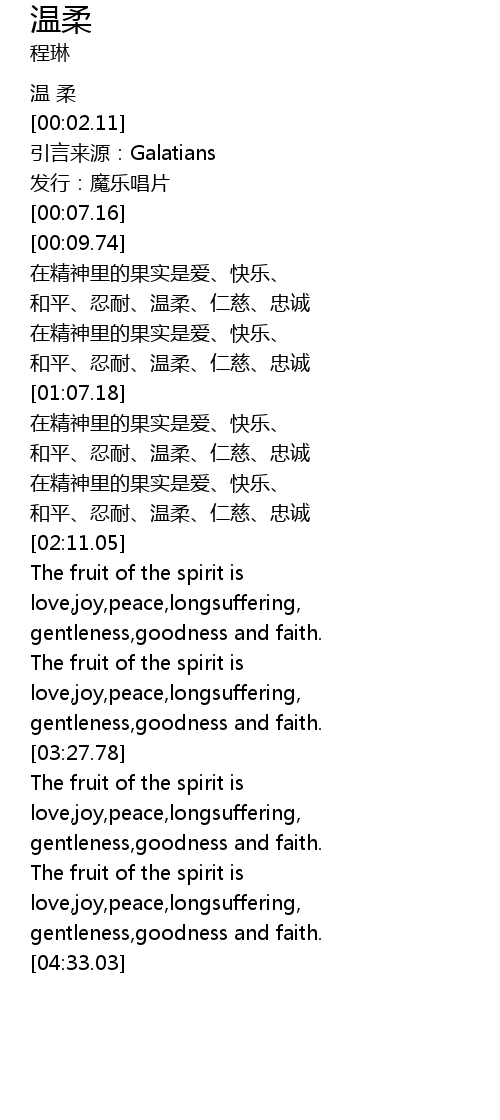 | [00:33.54] | 和平、忍耐、温柔、仁慈、忠诚 |