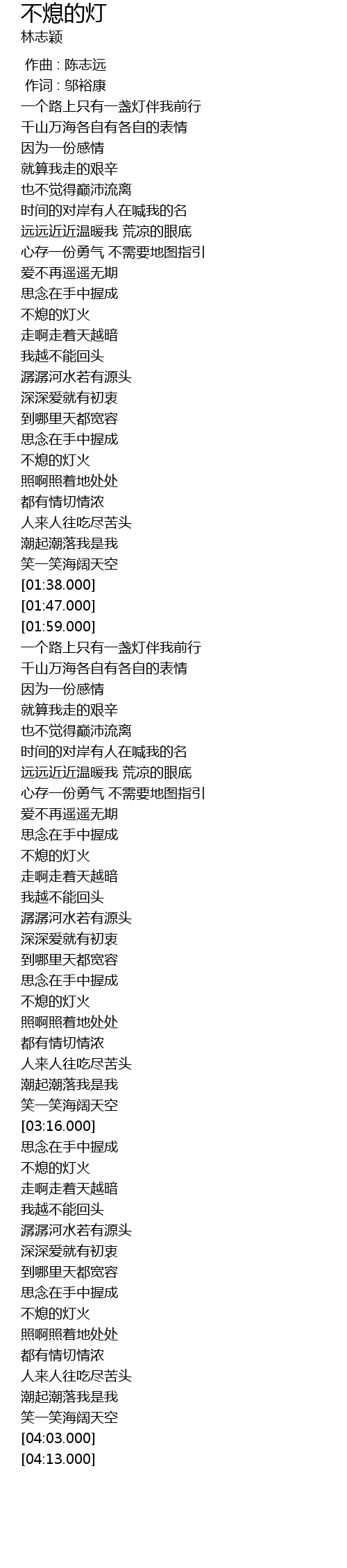 | [02:01.000] | yí gè lù shàng zhǐ yǒu yī zhǎn dēng bàn wǒ qián xíng |