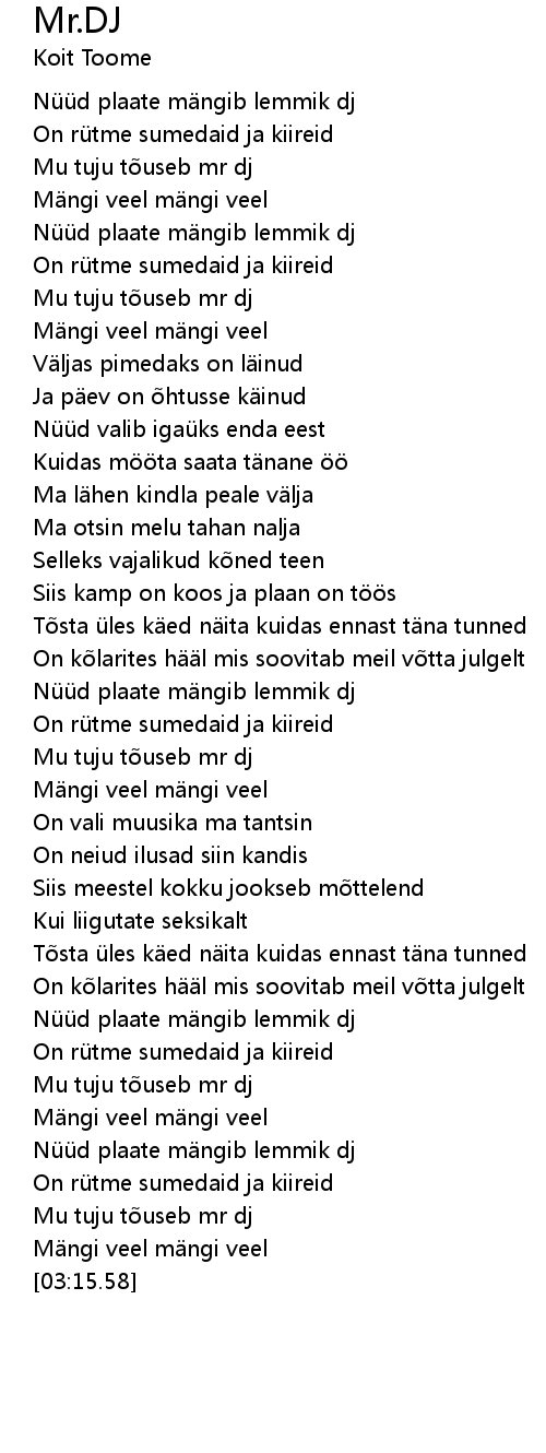 | [00:15.74] | Nüüd plaate mängib lemmik dj |