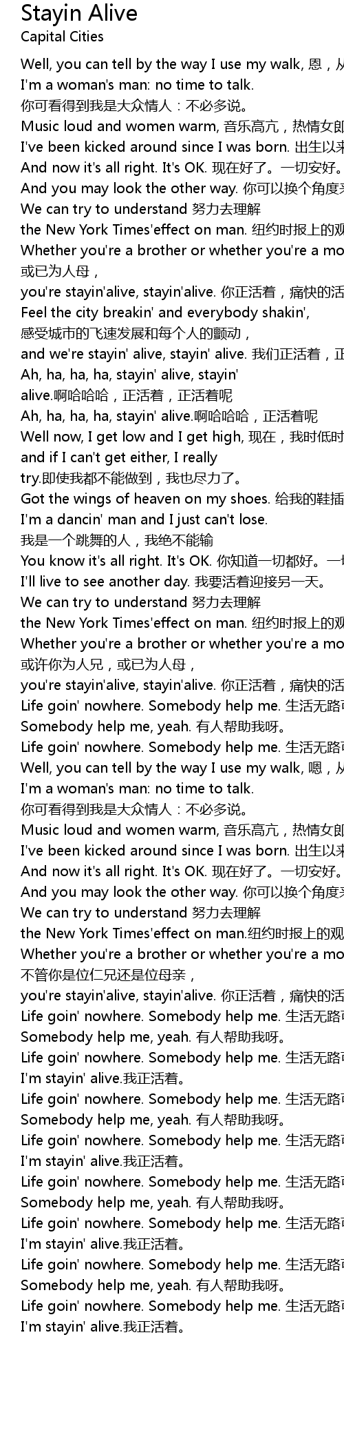 | and we' re stayin' alive, stayin' alive. wo men zheng huo zhe, zheng huo zhe ne. | |