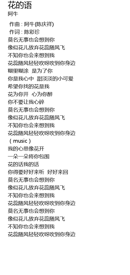 | [00:00.00] | 作曲 : 阿牛(陈庆祥) |