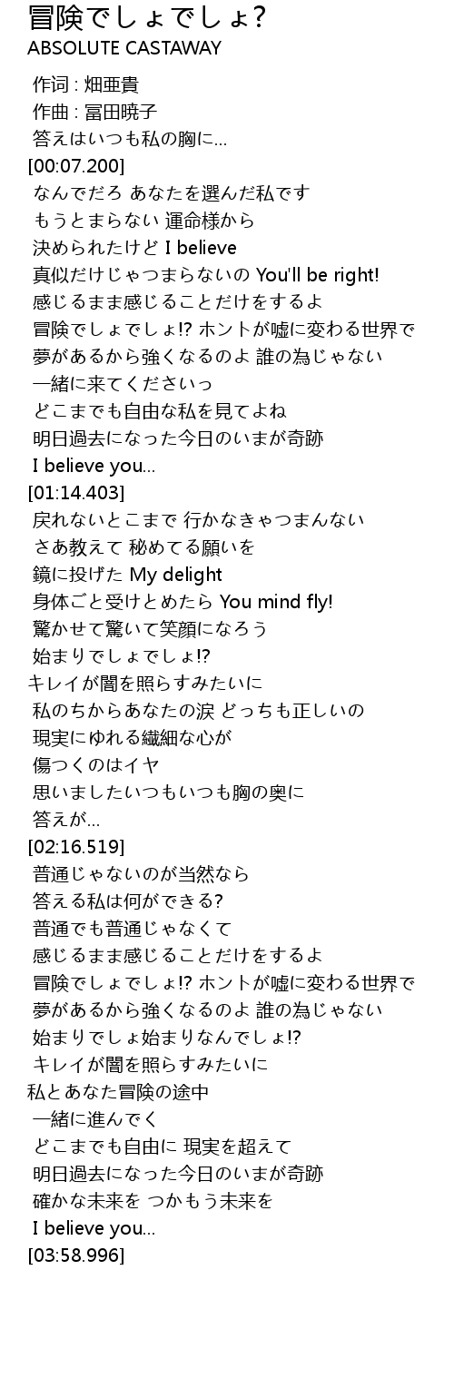 | [03:00.869] | 冒険でしょでしょ!? ホントが嘘に変わる世界で |