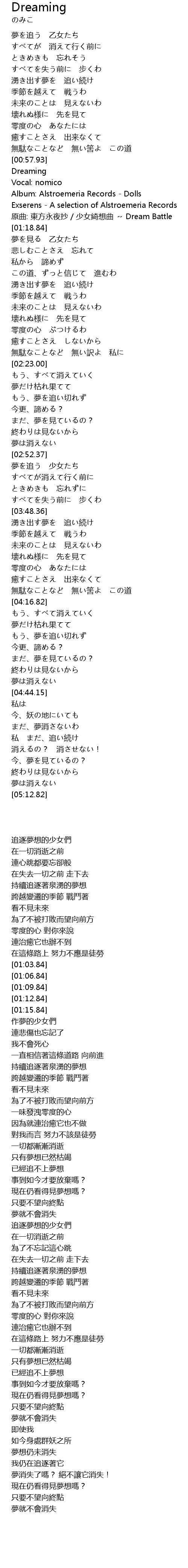 | [01:15.84] | yuán qǔ: dōng fāng yǒng yè chāo shào nǚ qǐ xiǎng qū Dream Battle |
